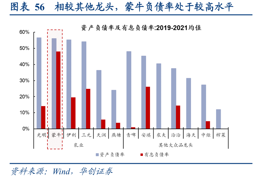 數(shù)據(jù)顯示,自2017年以來,蒙牛合計并購金額超百億,持續(xù)的并購讓蒙牛資產(chǎn)負債率一路飆升。截至2022年年末,蒙牛負債總額達到677.6億元,資產(chǎn)負債率為57.52%,其中有息負債占比約為50%,有息負債率明顯高于其他乳制品企業(yè)平均水平。