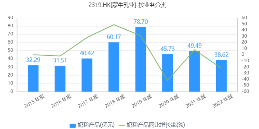 奶粉業(yè)務(wù)一度是蒙牛實現(xiàn)營收多元化的希望。2019年,蒙牛奶粉業(yè)務(wù)實現(xiàn)營收78.7億元,收入占比達到10%。