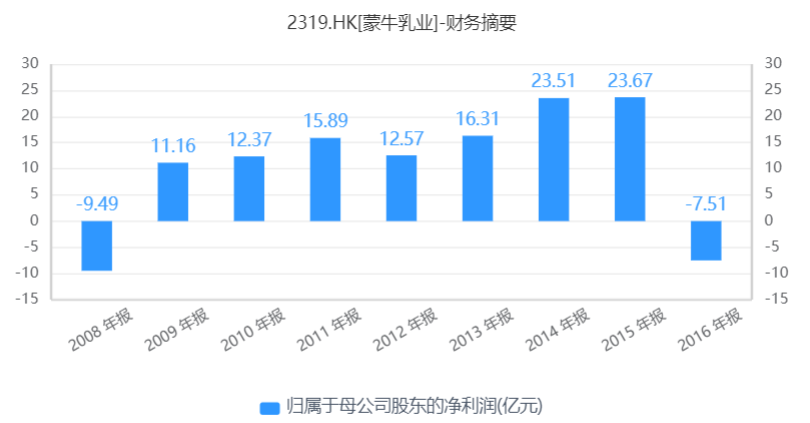 然而,資產(chǎn)整合效果不佳,在蒙牛營收規(guī)模創(chuàng)出新高的同時,公司利潤端表現(xiàn)卻遠不及預(yù)期。2016年,蒙牛乳業(yè)凈虧損達到7.51億元,繼2008年之后再次出現(xiàn)巨虧,主要是收購雅士利以及參股現(xiàn)代牧業(yè)給公司帶來了巨大拖累。