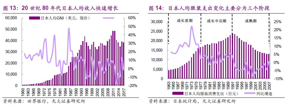 根據(jù)人均服裝支出增長情況,把1960年以后日本服裝行業(yè)發(fā)展分為三大階段: