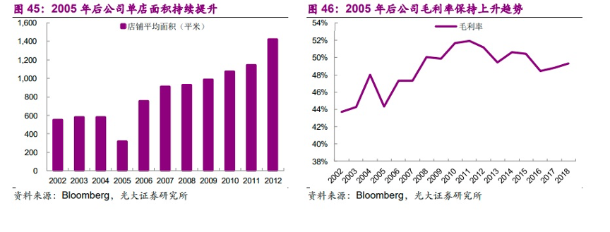 *店型:早期店鋪以郊區(qū)店、街邊店為主,面積約為500平方米;1998年后開始切入核心商圈的專賣店、購物中心等,店鋪面積拓展到800平米;2005年后公司推出大店改造計劃,開店面積達1600平米,2012年后大部分新開旗艦店面積達3000平米以上。
