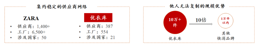 早期通過減少商品種類,擴大單個產(chǎn)品生產(chǎn)數(shù)量及生產(chǎn)總額,以優(yōu)于競爭公司的條件找到生產(chǎn)廠商,獲得更低成本。且盡量控制優(yōu)衣庫的產(chǎn)品份額占工廠生產(chǎn)總額的50%,持續(xù)控制成本及質(zhì)量。