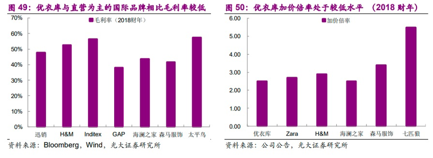 *優(yōu)衣庫通過規(guī);刂瞥杀尽⒉捎霉δ苄詢(yōu)質(zhì)面料,性價比在業(yè)內(nèi)處于較高水平。從倍率來看,優(yōu)衣庫與快時尚定位的Zara、H&M、GAP等公司相比均以直營為主,而毛利率處于較低水平(47%左右),顯示產(chǎn)品加價倍率不高,在2.5倍左右。