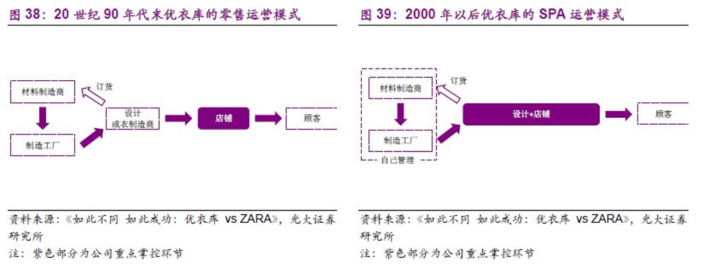 優(yōu)衣庫的SPA模式下,品牌方對產(chǎn)業(yè)鏈的參與度更高,幾乎對產(chǎn)業(yè)鏈的所有環(huán)節(jié)均進行深度參與。掌控全產(chǎn)業(yè)鏈控制,盡可能減少中間商環(huán)節(jié),壓縮一切非必要成本。