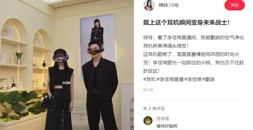 也難怪,近來扎堆發(fā)測評的除了科技博主,還有很多時尚博主,眼線飛揚(yáng)、皮衣挺括,佩戴著空氣凈化耳機(jī),像戴著重型機(jī)甲操縱器。