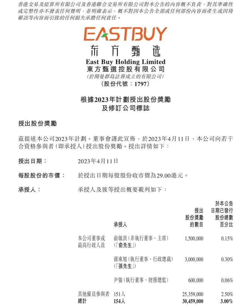 除三名高管外,其余151名參與者均為東方甄選雇員。獲得合計(jì)2535.9萬股股份激勵(lì),價(jià)值約7.4億港元。
