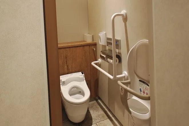 日本的衛(wèi)生間裝備是非常齊全的。電動(dòng)馬桶、手消毒液、一主一備的卷筒紙以外,還有寶寶座椅,能讓奶爸臨時(shí)放置下小寶寶;結(jié)實(shí)的把手,助坐久了的顧客一臂之力。