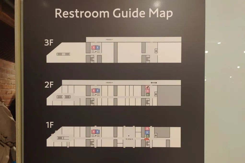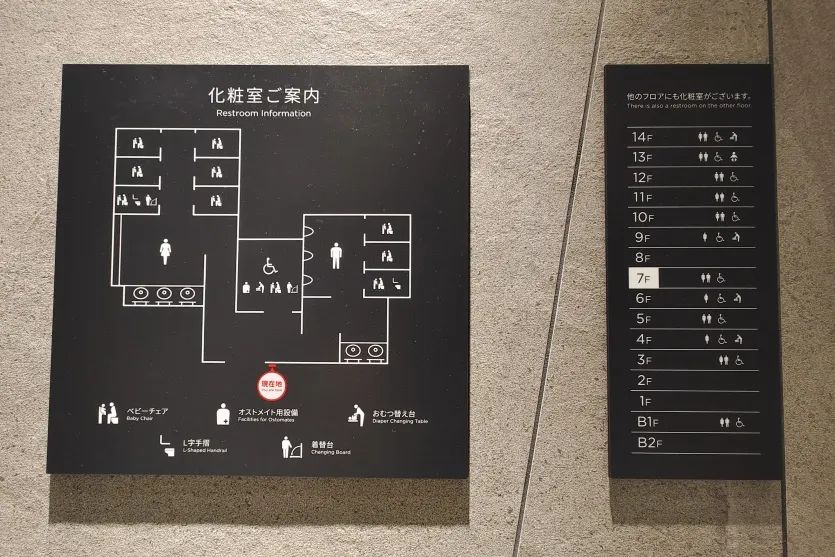 可以看到,日本購(gòu)物中心在廁所門(mén)口,會(huì)清楚標(biāo)識(shí)出,該衛(wèi)生間內(nèi)有多少個(gè)隔間、是否有無(wú)障礙設(shè)施、寶寶座椅、換尿布臺(tái)等等。