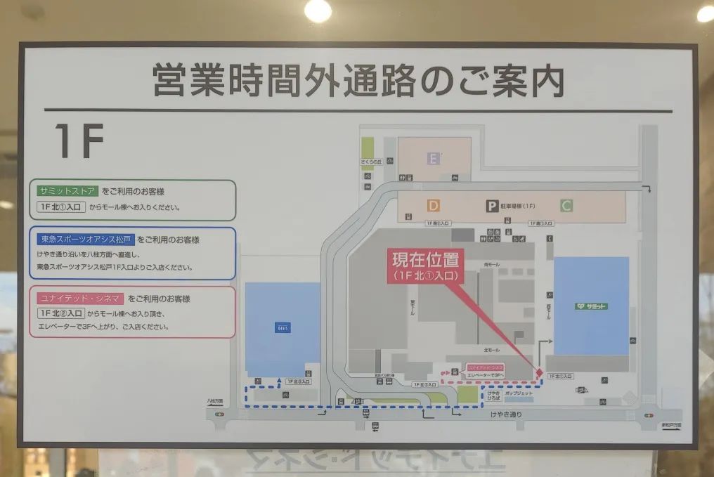 國(guó)內(nèi)大部分商場(chǎng)都設(shè)有夜間散場(chǎng)動(dòng)線的指引,當(dāng)然指引的清晰和到位程度就參差不齊了。日本除此之外,針對(duì)部分提早開(kāi)業(yè)的業(yè)態(tài),會(huì)在商場(chǎng)的入口處玻璃門(mén)上,張貼早間入場(chǎng)動(dòng)線,告訴你在非營(yíng)業(yè)時(shí)間,如何進(jìn)入商場(chǎng)。