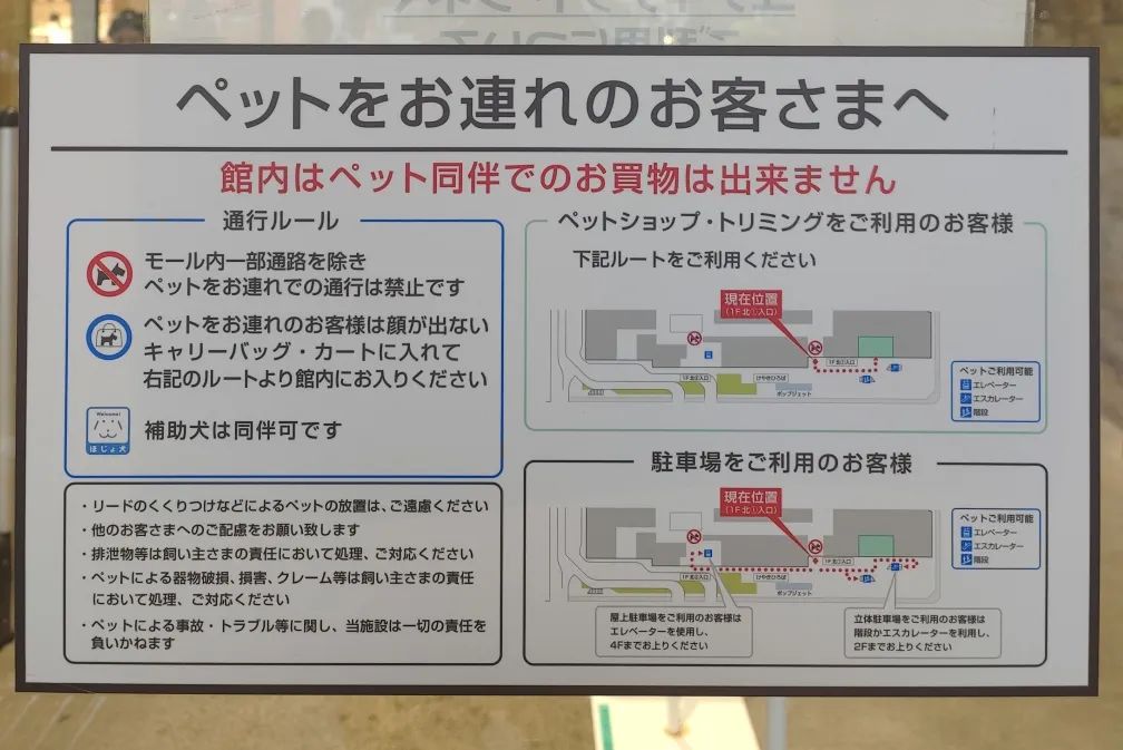 與上述動(dòng)線類(lèi)似,商場(chǎng)的入口處也張貼有寵物友好動(dòng)線,指引需要前往寵物美容館的顧客。還特別溫馨的提示了步行或者駕車(chē)前來(lái)的不同路線。