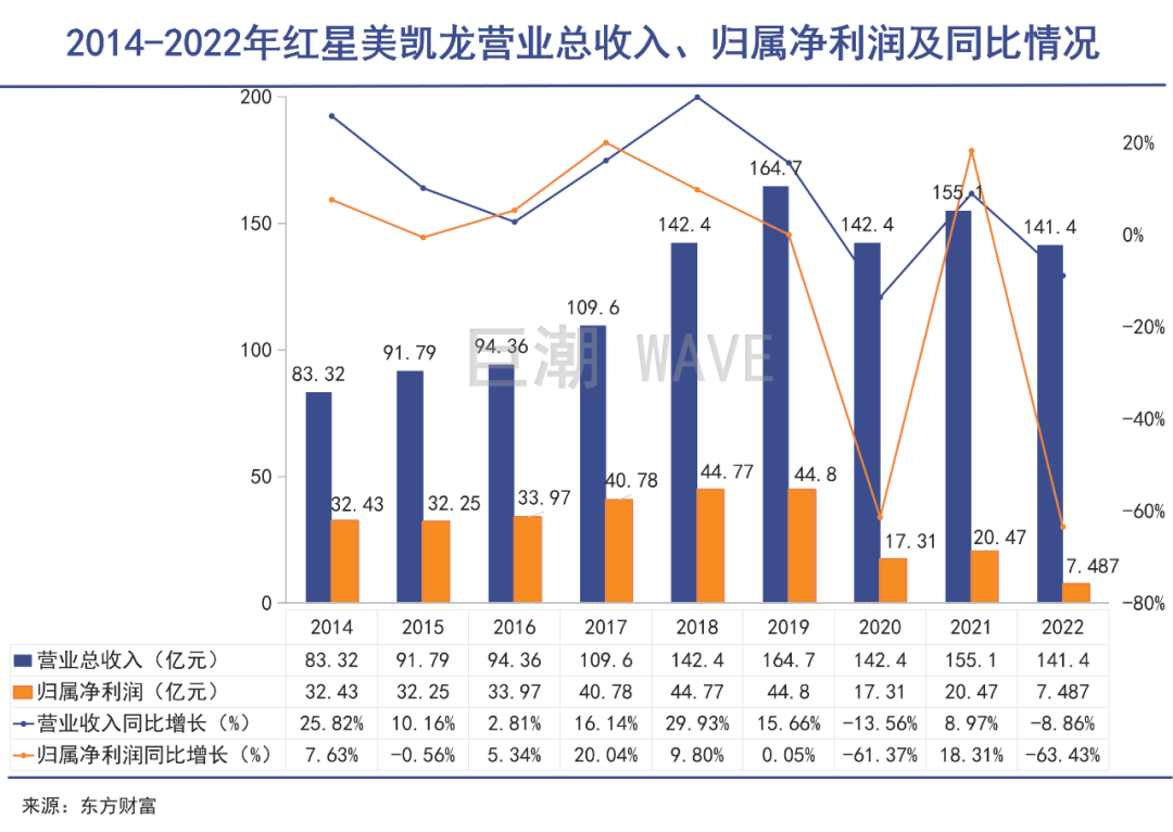 2023年3月31日,美凱龍披露年報,公司2022年實現(xiàn)營業(yè)總收入141.38億元,同比下降8.9%;實現(xiàn)歸母凈利潤7.49億元,同比下降63.4%;每股收益為0.17元。這是紅星美凱龍近十年來、也是近三年來的第二次營業(yè)收入同比下降。