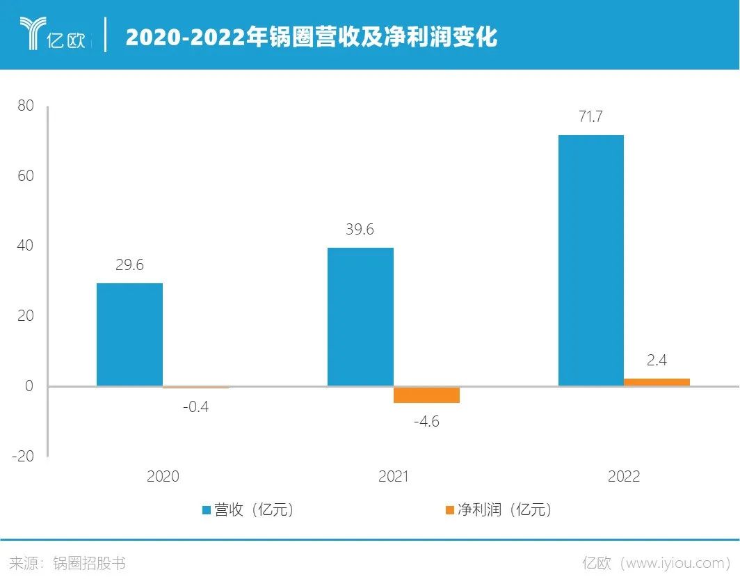 因此當(dāng)其他火鍋燒烤店的關(guān)門、虧損成為常態(tài)時(shí),瘋狂開店的鍋圈卻上演著“速度與激情”。2020-2022年,鍋圈的總營收翻了一倍多,從29.6億元迅速飆升至71.7億元;2022年,鍋圈實(shí)現(xiàn)首次盈利,凈利潤2.41億元。