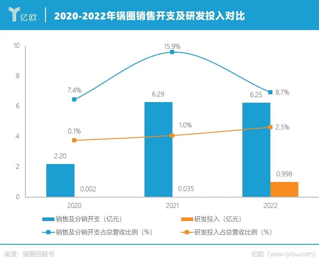 一位消費(fèi)分析師指出,觀察鍋圈近年來的舉措,不免有“重營銷、輕研發(fā)”的嫌疑。2020-2022年,公司年研發(fā)投入金額僅為23.5萬元、348.7萬元和9981萬元,只占到當(dāng)期營收的0.1%、1%和2.5%。