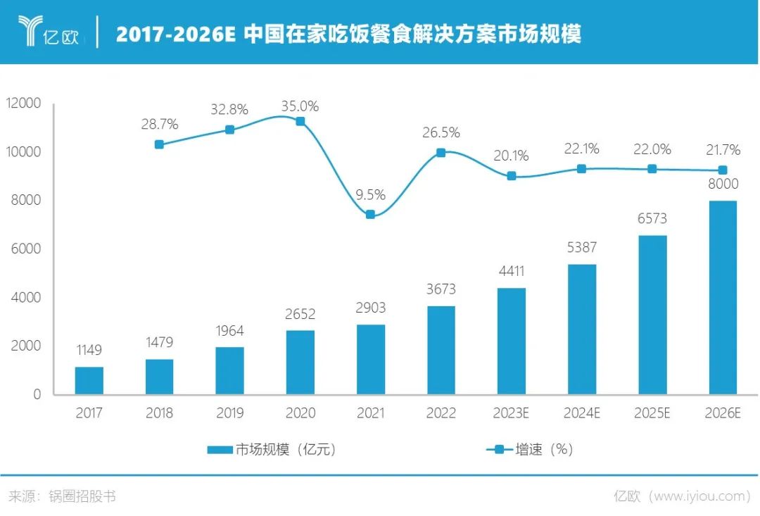 招股書里提到,中國在家吃飯餐食解決方案市場(chǎng)的總收入由2017年的1149億元大幅增長至2021年的2903億元,復(fù)合年增長率為26.1%;預(yù)計(jì)于2026年將達(dá)到8000億元,自2021年起的復(fù)合年增長率為22.5%。