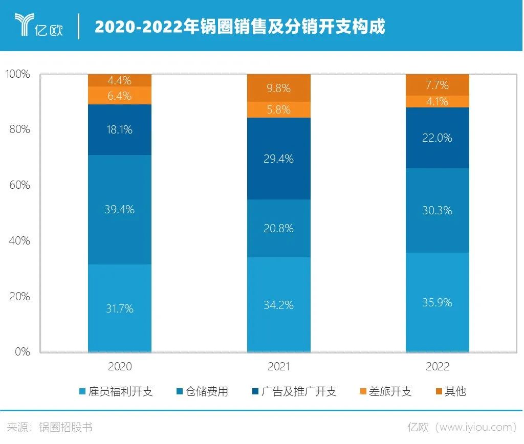 招股書顯示,2020-2022年鍋圈銷售及分銷開支分別為2.2億元、6.29億元和6.25億元,占同期總營收的7.4%、15.9%、8.7%。具體來看,銷售及分銷開支主要包括雇員福利開支、倉儲(chǔ)費(fèi)用、廣告及推廣開支、差旅開支,其中逐年攀升的雇員福利開支占比已超過1/3。