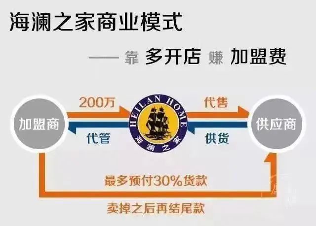 簡(jiǎn)單理解就是,海瀾之家整合上游服裝廠,以先拿貨后付款的方式(在貨品最初入庫(kù)的時(shí)候,海瀾之家并不會(huì)一次性支付全部貨款,而是支付不超過(guò)30%,后續(xù)資金隨貨品的實(shí)際銷售情況逐月結(jié)算)獲得貨品,再投入下游的加盟直營(yíng)店之中。
