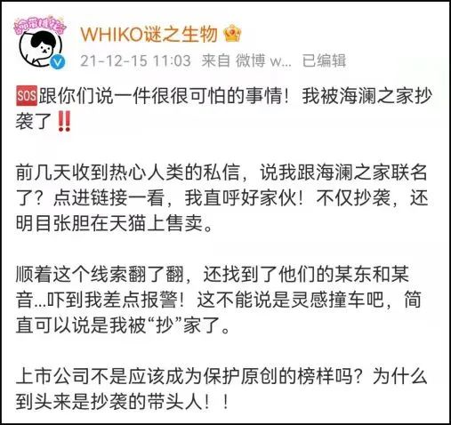 2021年12月,原創(chuàng)消費(fèi)品牌WHIKO謎之生物稱,被海瀾之家抄襲了品牌IP形象,爭(zhēng)議之下,海瀾之家不得不進(jìn)行全網(wǎng)下架。