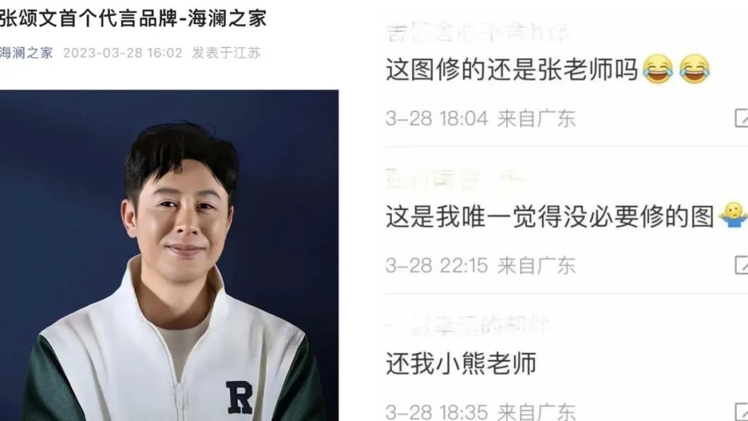 終于, 3月28日,海瀾之家在官微宣布拿到了張頌文的“首個(gè)代言”。本以為可以人氣銷量雙豐收,誰(shuí)知代言海報(bào)卻被網(wǎng)友罵上了熱搜,“過(guò)度P圖像蠟像”、“挪用路演圖”、“吃相難看”等質(zhì)疑愈演愈烈。