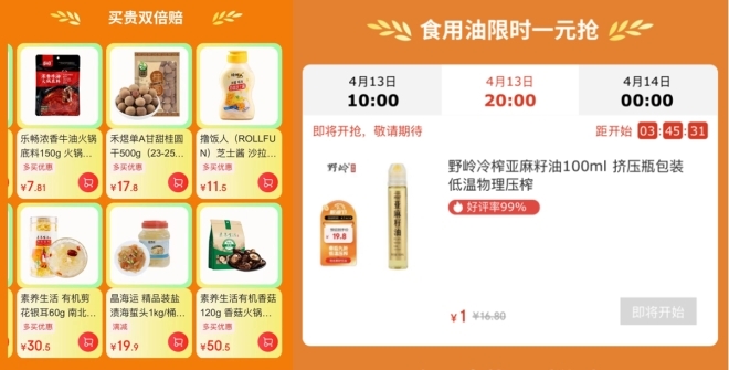 此次糧油節(jié)期間,京東超市為消費(fèi)者提供食用油、米面雜糧、調(diào)味品、干貨等眾多大牌、優(yōu)質(zhì)產(chǎn)品,并在每天0點(diǎn)、10點(diǎn)、20點(diǎn)等多個(gè)節(jié)點(diǎn)推出食用油限時(shí)1元搶活動(dòng),為消費(fèi)者提供更多低價(jià)且高品質(zhì)的糧油調(diào)味商品。
