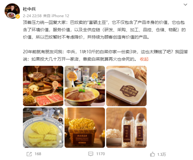 在最初消費者質疑定價太高的時候,杜中兵還發(fā)微博硬氣回應,稱“富硒土豆”貴有貴的道理,巴奴不會考慮降價。