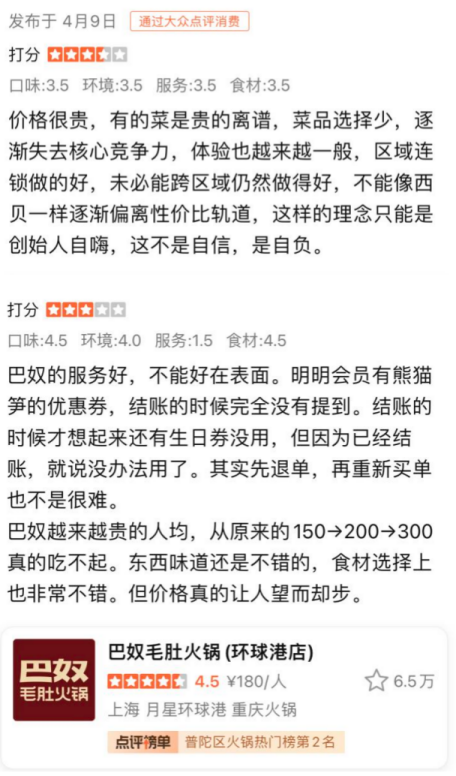 來自消費者的真實評價也證明確實如此,大部分顯示人均消費200元以上,并且抱怨“貴又吃不飽”“除了毛肚大部分菜品平平無奇”等。