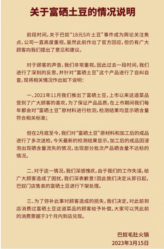 此外,巴奴火鍋曾因“18元5片土豆”事件受到關注,今年3·15又經歷了“富硒土豆事件”的輿論危機。