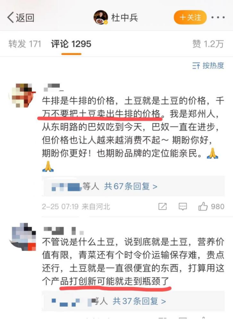 杜中兵那條“不漲價”微博下的高贊評論更是直接道出了消費者內心所真正介意的一點:“牛排是牛排的價格,土豆是土豆的價格,千萬不要把土豆賣出牛排的價格”。
