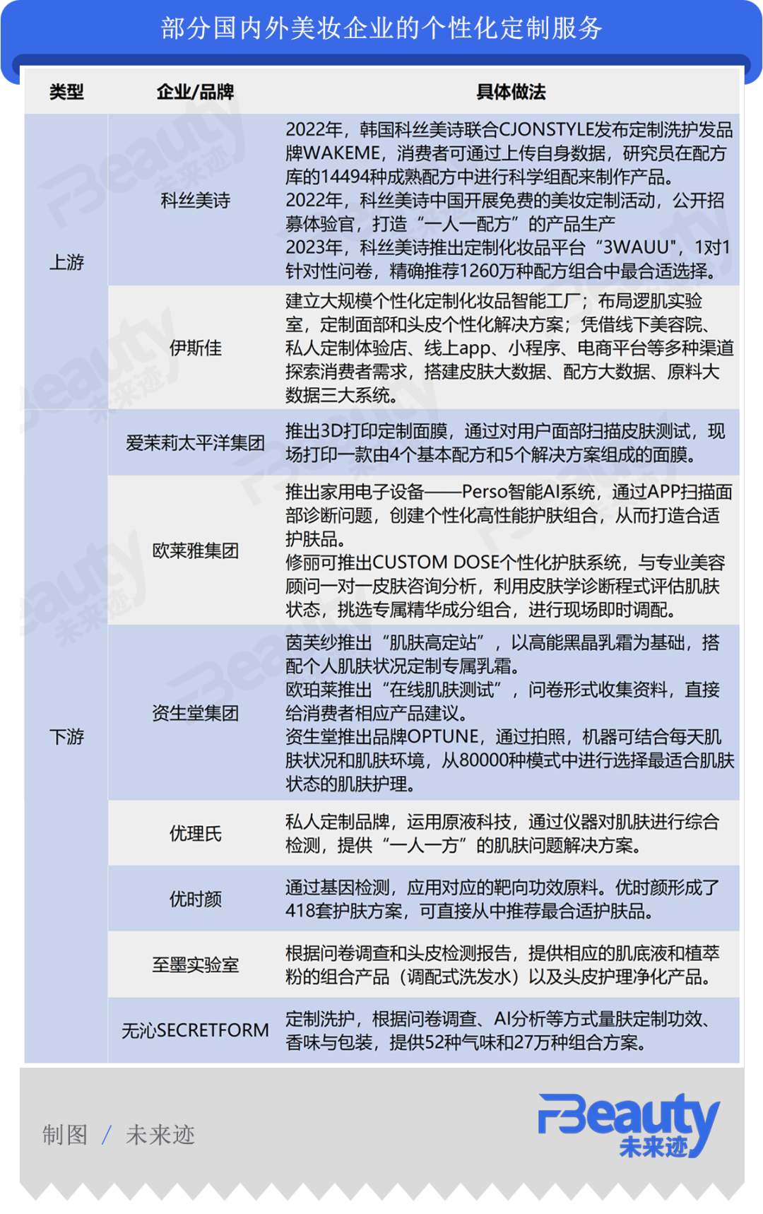 《FBeauty未來(lái)跡》發(fā)現(xiàn),“個(gè)性化定制”概念可分為兩大類:1、一人一配方的“完全”定制。2、提供多種、有限的方案基礎(chǔ)上,匹配肌膚的最佳“定制”。