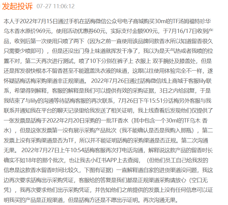 也有消費(fèi)者在話梅微信公眾號(hào)電子商城購買了30ml的TF湯姆福特珍華烏木香水后,“懷疑話梅商店出售假貨”。根據(jù)其提供的多張與話梅客服的聊天記錄,上述消費(fèi)者多次要求話梅提供有效的采購證據(jù),但對(duì)方僅提供了一張發(fā)票是話梅于2022年2月20日采購的一批TF香水,“但是這張發(fā)票第一沒有展示采購產(chǎn)品批次(我不能確認(rèn)是否是我購入那瓶),第二發(fā)票上沒有采購渠道是否為TF,所以并不能證明話梅的采購渠道是否正規(guī)!