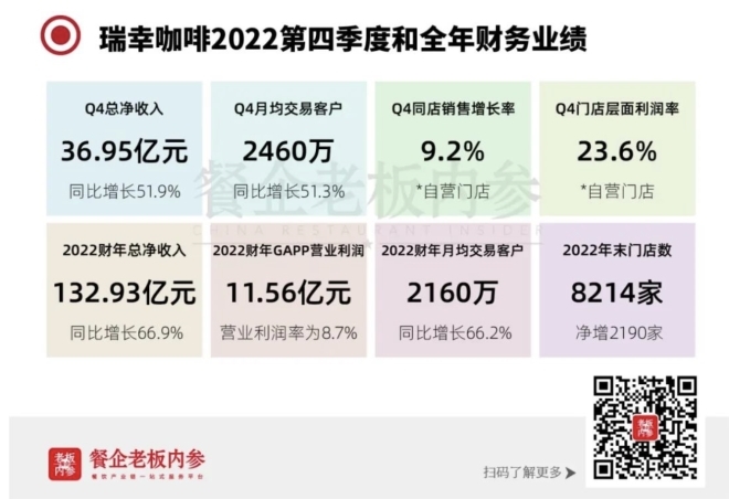 2022財年瑞幸咖啡的凈新開門店2190家,同比增長36.4%。相當于每天開6家門店。截至2022年末,瑞幸咖啡在中國擁有8214家營業(yè)門店,其中自營門店5652家,聯(lián)營門店2562家。