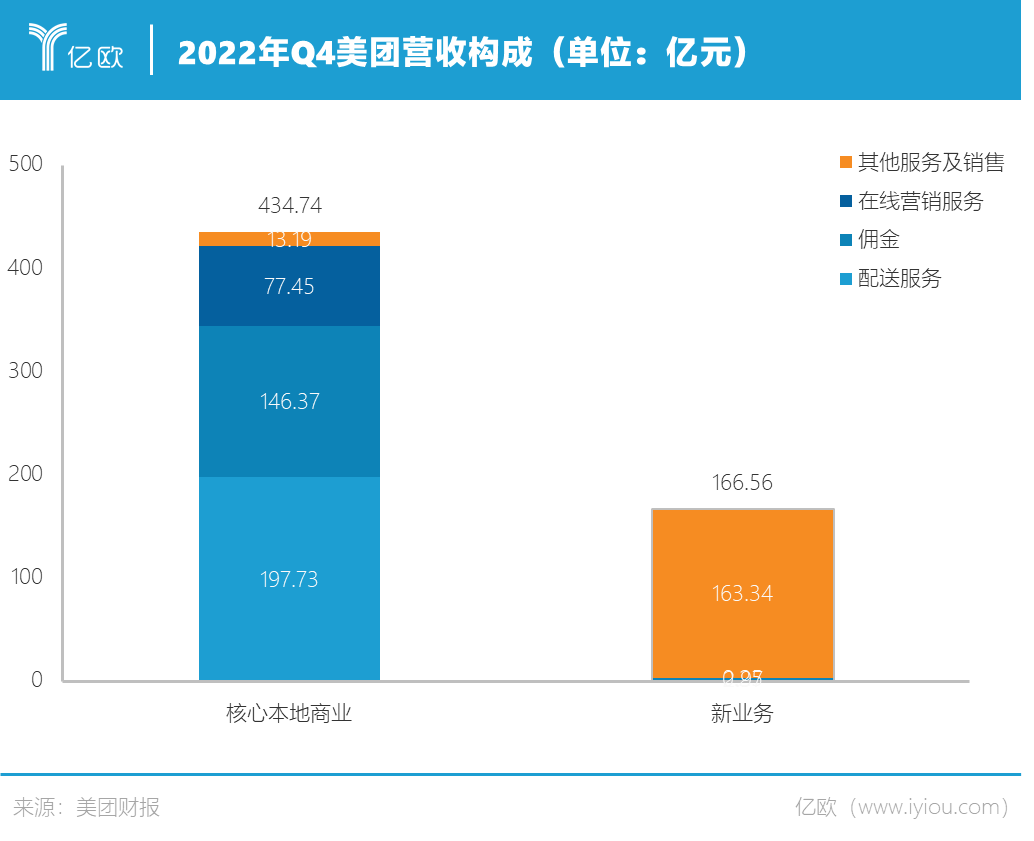 所謂核心本地商業(yè),包括外賣(mài)、到店、酒旅及美團(tuán)閃購(gòu)、民宿及交通票務(wù)等。這部分業(yè)務(wù)在2022年Q4收入為435億元,占總營(yíng)收比重達(dá)72%,同期美團(tuán)優(yōu)選、美團(tuán)買(mǎi)菜、網(wǎng)約車(chē)等新業(yè)務(wù)收入167億元,占比28%。