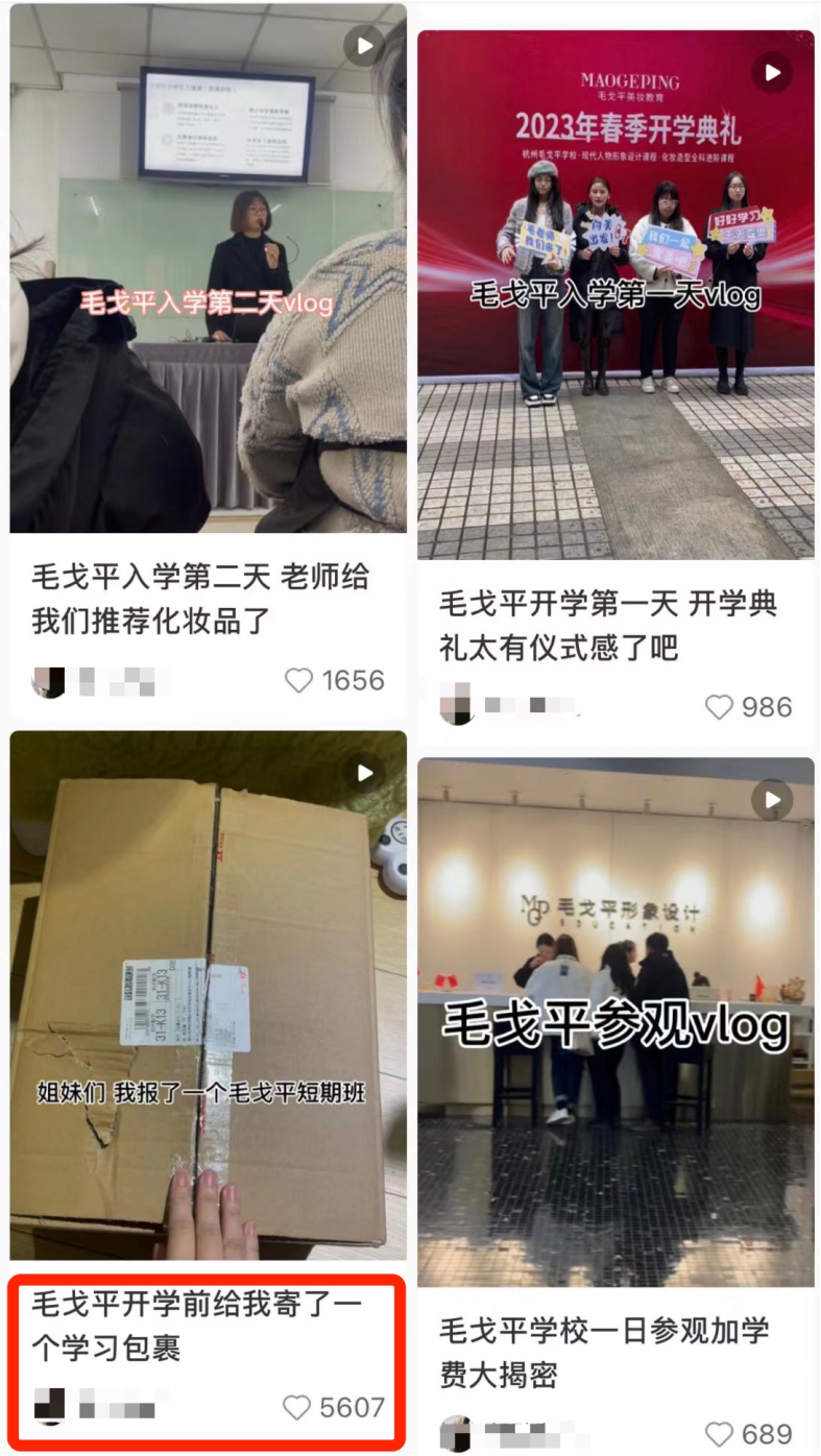 在社交平臺通過分享在毛戈平學校的化妝經(jīng)驗,不少學員借勢成為美妝博主,郭貼貼兒就是其中一員,上學一個月,分享每天的上學VLOG,包括化妝教程、發(fā)型教程,她已經(jīng)在小紅書擁有3.2萬粉絲,點贊最高的一條“拆短期班學習包裹”點贊超五千。