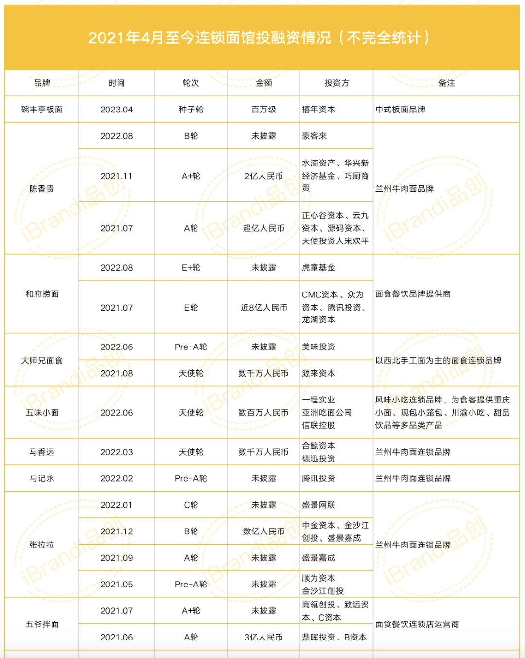 據(jù)iBrandi品創(chuàng)不完全統(tǒng)計,自2021年4月至今,近兩年來,共有9個連鎖面館項目獲得融資,雖然數(shù)量不多,但部分項目都在短時間內完成了2-3次融資。