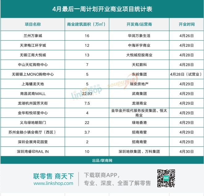 4月最后一周,全國(guó)至少有13個(gè)商業(yè)項(xiàng)目將開(kāi)業(yè)