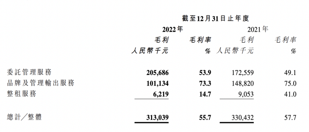 年報(bào)中提及,毛利率的下滑主要是受品牌及管理輸出服務(wù)部分收入占比減少,及整租項(xiàng)目毛利率受疫情影響及新開業(yè)項(xiàng)目影響有所下降所致。