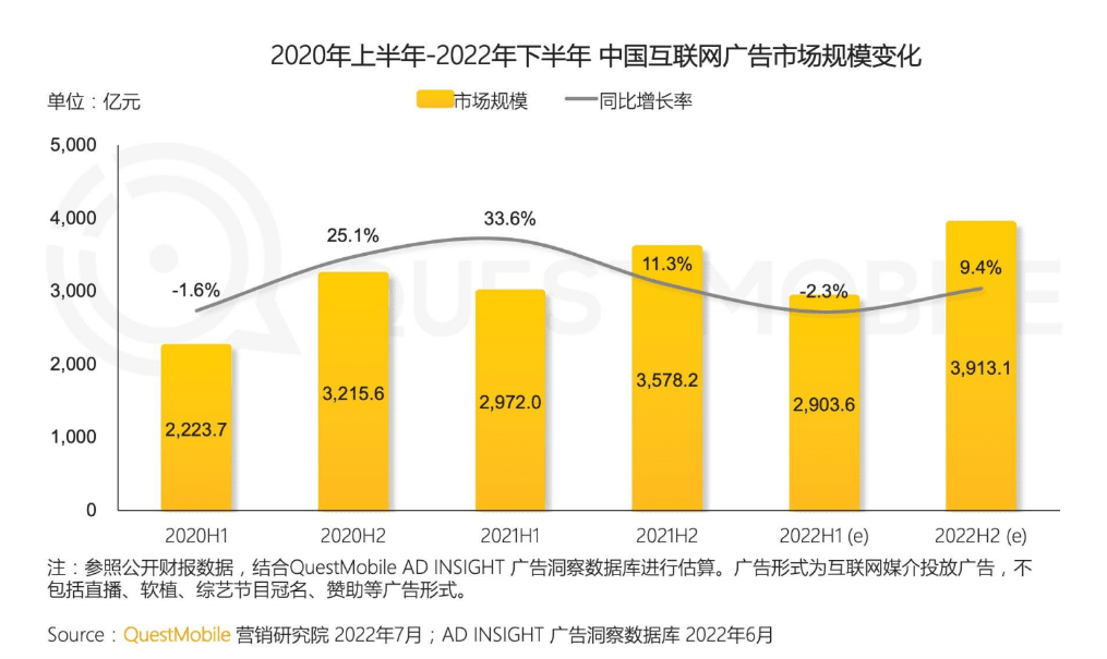 QuestMobile發(fā)布的《2022互聯(lián)網(wǎng)廣告市場半年大報告》顯示,2022年上半年,中國互聯(lián)網(wǎng)廣告市場規(guī)模同比下滑2.3%至2903.6億元,廣告投放品牌數(shù)量同比下降38.3%。