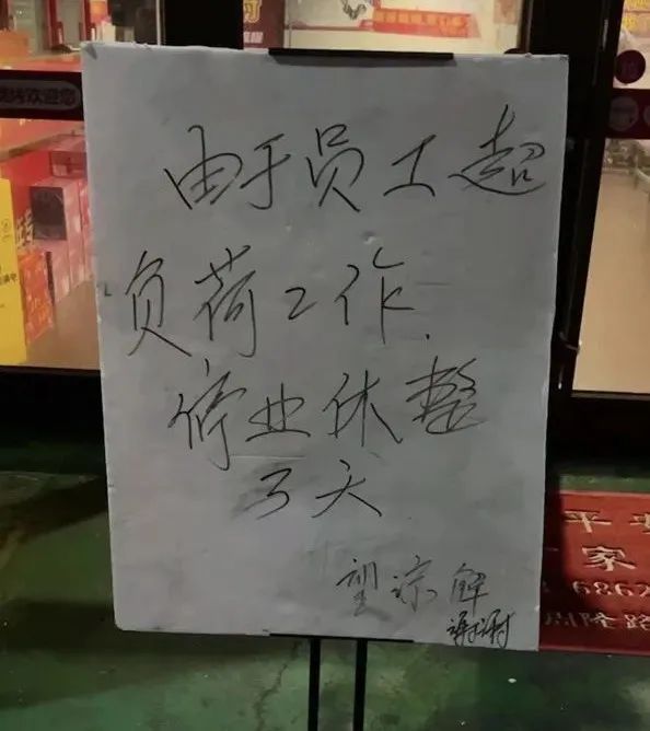 視頻中,燒烤店門前,貼出了臨時閉店通知,內(nèi)容顯示:“由于員工超負荷工作,停業(yè)休整三天!
