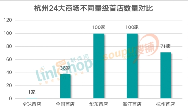 4、從首店角度看,24家商場(chǎng)總計(jì)引入了310家首店,包括全球首店1家,全國(guó)首店38家,華東首店和浙江首店均為100家,最低量級(jí)的杭州首店也有71家。其中全球首家CARTIER Salon花落杭州大廈。從單體商場(chǎng)首店引入情況看,湖濱銀泰in77首店規(guī)模最大,達(dá)到了51家,占該項(xiàng)目當(dāng)年度新開(kāi)品牌數(shù)量的39.8%,占樣本商場(chǎng)首店總數(shù)的16.5%。其次是杭州大廈,引進(jìn)30家首店品牌,龍湖杭州濱江天街去年表現(xiàn)也較突出,吸引了25家首店品牌的進(jìn)駐。