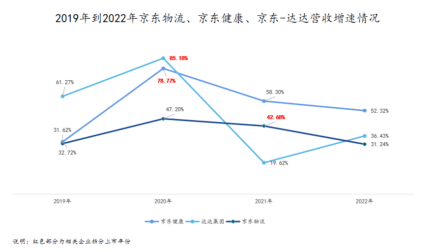 為全面評估京東系上市公司的成長性,我們將達達、京東健康、京東物流上市前后的業(yè)績進行對比,雖然三家企業(yè)業(yè)績均實現(xiàn)了正向增長,但京東健康的增速最快,京東物流整體表現(xiàn)相對平穩(wěn),達達業(yè)績整體業(yè)績波動性較大。