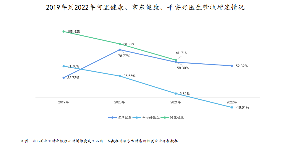 從具體公司來看,京東健康表現(xiàn)相對穩(wěn)定。得益于疫情期間消費者對醫(yī)療物資和藥品的需求增加,過去幾年京東健康整體業(yè)績表現(xiàn)優(yōu)異。將京東健康和同行業(yè)的平安好醫(yī)生、阿里健康業(yè)績進行對比后可以發(fā)現(xiàn),2020年三家互聯(lián)網(wǎng)醫(yī)藥平臺業(yè)績均出現(xiàn)不同程度增長,但此后阿里健康、平安好醫(yī)生增速已出現(xiàn)明顯回落,但京東健康的業(yè)績增速整體相對穩(wěn)定。