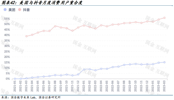 國(guó)金證券今年4月發(fā)布的《美團(tuán)-W港股公司深度研究:撥云見日,到店競(jìng)爭(zhēng)格局疫后或改善》顯示,截止今年3月,重合用戶占抖音本地生活用戶的56%左右,但只占美團(tuán)用戶的15%左右,且重合用戶去年在美團(tuán)下單頻次雖有7~13%的下滑幅度,但自去年12月疫情放開至今,下單頻次已重歸增長(zhǎng)——美團(tuán)用戶的基本盤未受太大影響。