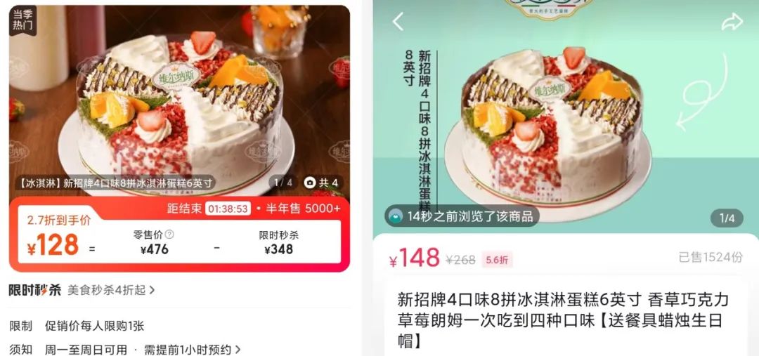 外賣方面的情況也類似,以連鎖品牌維爾納斯意大利手工藝蛋糕為例,其一嘴黑6英寸蛋糕的抖音外賣價(jià)為168元,直播間價(jià)格低一些,為138元,這與美團(tuán)外賣價(jià)一致;還有一款8拼6英寸冰淇淋蛋糕,抖音外賣價(jià)格為148元,美團(tuán)則便宜20元,為128元。