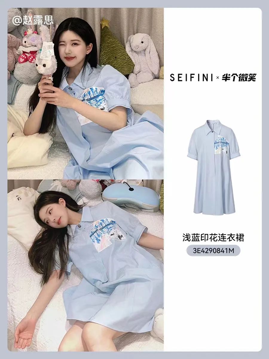 演員趙露思上身 SEIFINI詩凡黎x半個微笑 淺藍色印花連衣裙