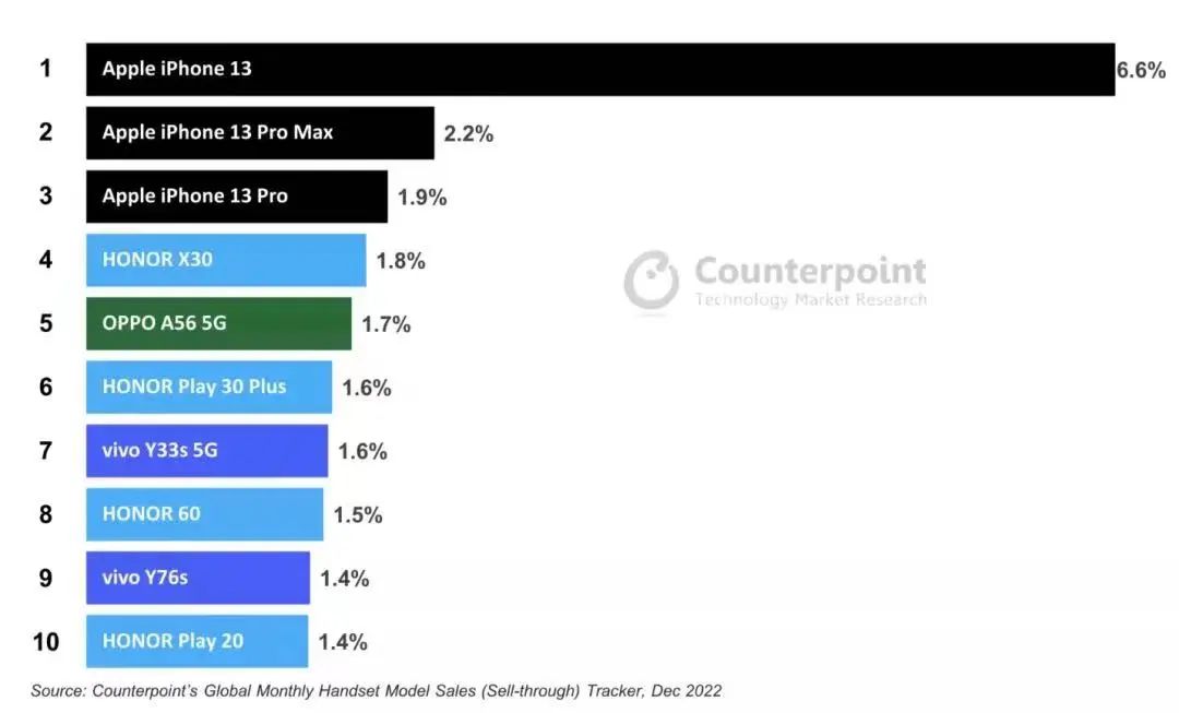 在高端市場(chǎng)鏖戰(zhàn)的小米,中低端市場(chǎng)的基本盤也出現(xiàn)松動(dòng)。據(jù)Counterpoint數(shù)據(jù),截至2022年12月,國(guó)內(nèi)最暢銷的手機(jī)機(jī)型榜單中,小米首次跌出前十。