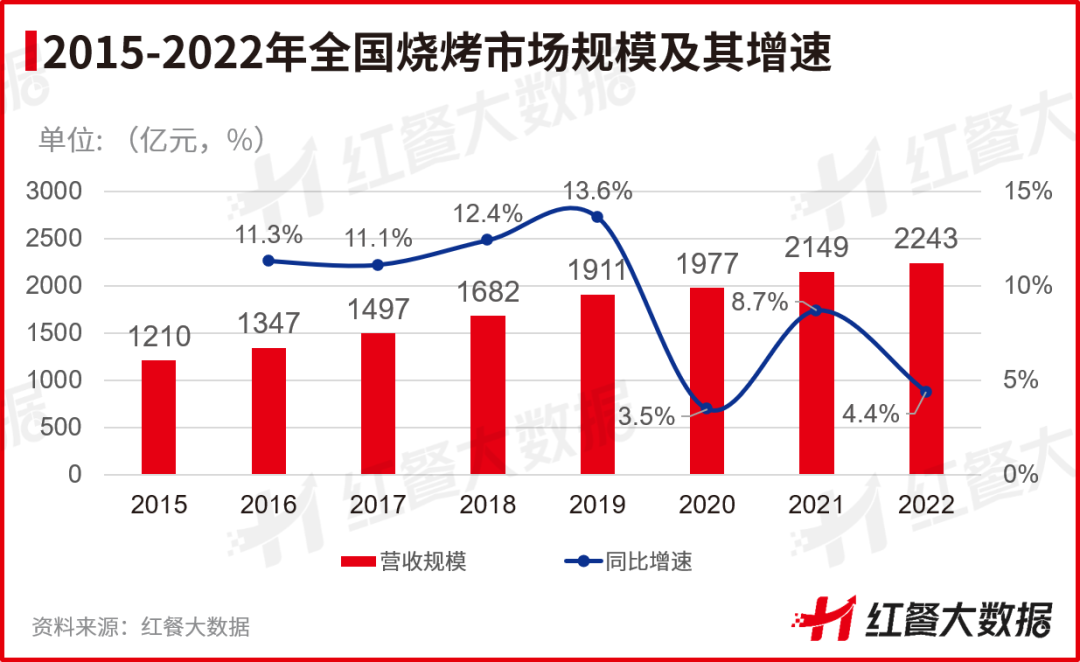 經(jīng)過多年的發(fā)展,燒烤品類已經(jīng)積累了龐大的消費群體,加上夜經(jīng)濟的助力,其市場規(guī)模也在持續(xù)增長,2022年燒烤品類市場規(guī)模突破了2200億元。