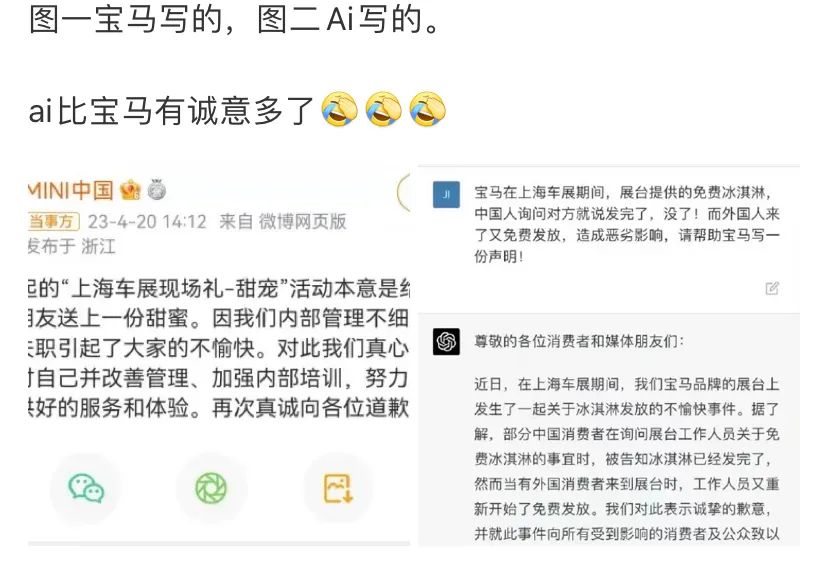 隨后,寶馬mini官方發(fā)布致歉聲明,稱”因內部管理不細致和工作人員失職引起了大家的不愉快”,被網(wǎng)友指責公關態(tài)度不誠懇、公關水平低劣,“還不如ChatGPT寫的”,之后官方公關聲明和ChatGPT聲明兩張圖被一起流傳在網(wǎng)絡,引起群嘲。