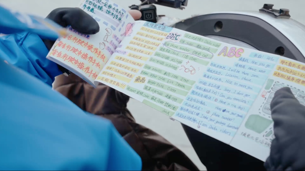 送單間隙,張煥榮會掏出女兒做的跑單手冊,對照上面的中英文短語,抓緊時間多念幾遍。這樣如果碰到外國用戶,就能更自如地交流。