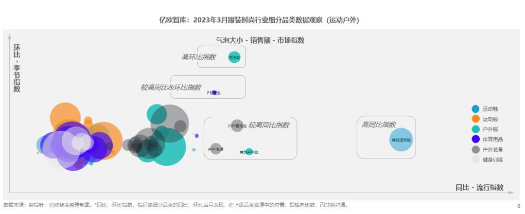 《報告》指出,3月正值春暖花開、冰河春醒的時節(jié),“外出”成為常態(tài),戶外服深受消費(fèi)者青睞,銷售額環(huán)比增長76.0%,同比增長21.2%,戶外鞋、戶外裝備3月環(huán)比分別上升72.4%,57.7%。