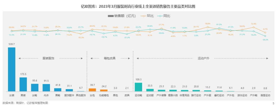 近日,億歐智庫發(fā)布《新消費(fèi)行業(yè)月度觀察報告-服裝時尚-3月篇》!秷蟾妗贩Q,隨著經(jīng)濟(jì)穩(wěn)步復(fù)蘇、消費(fèi)需求回升,大部分行業(yè)3月線上銷售額同比增長明顯,其中與服裝時尚相關(guān)的三個品類都實(shí)現(xiàn)了同比上升。