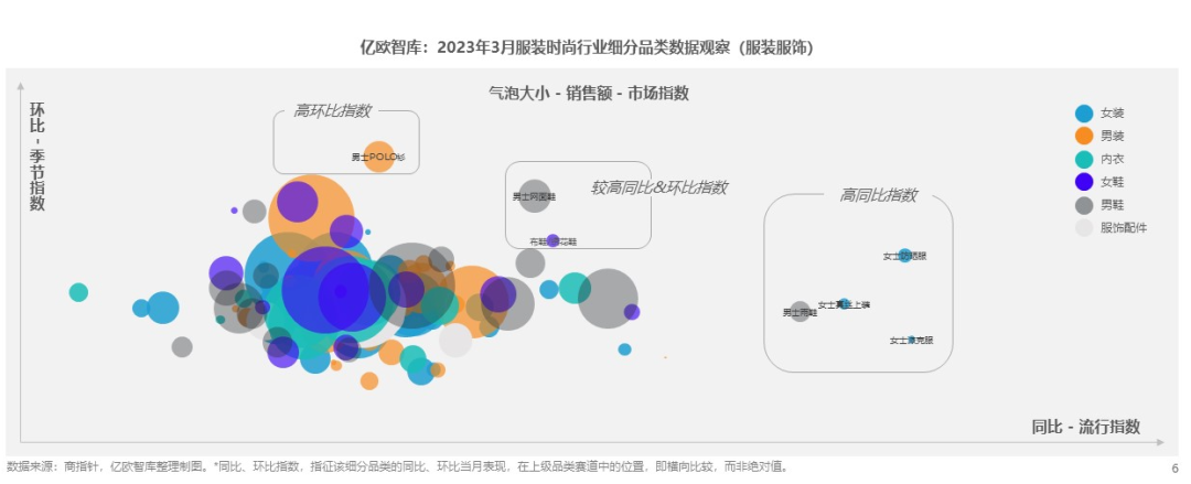 隨著氣溫逐步回升,人們的戶外活動愈加多樣化,帶動了不少細(xì)分品類增長。與其他細(xì)分品類相比,女士派克服、防曬服、真絲上裝、男士雨鞋呈現(xiàn)高同比指數(shù);男士POLO衫較上月連續(xù)呈現(xiàn)高環(huán)比指數(shù);男士網(wǎng)面鞋、布鞋/繡花鞋既呈現(xiàn)較高同比、環(huán)比指數(shù),屬于3月鞋品中的暢銷單品。